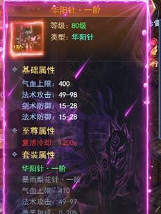 华阳针:相传最初为神医扁鹊所用,华阳聚三焦,捻提用三法,收精聚炁引神,纵然无常也难索命。游戏中华阳针,有起死回生之效用,可让佩戴者原地重生